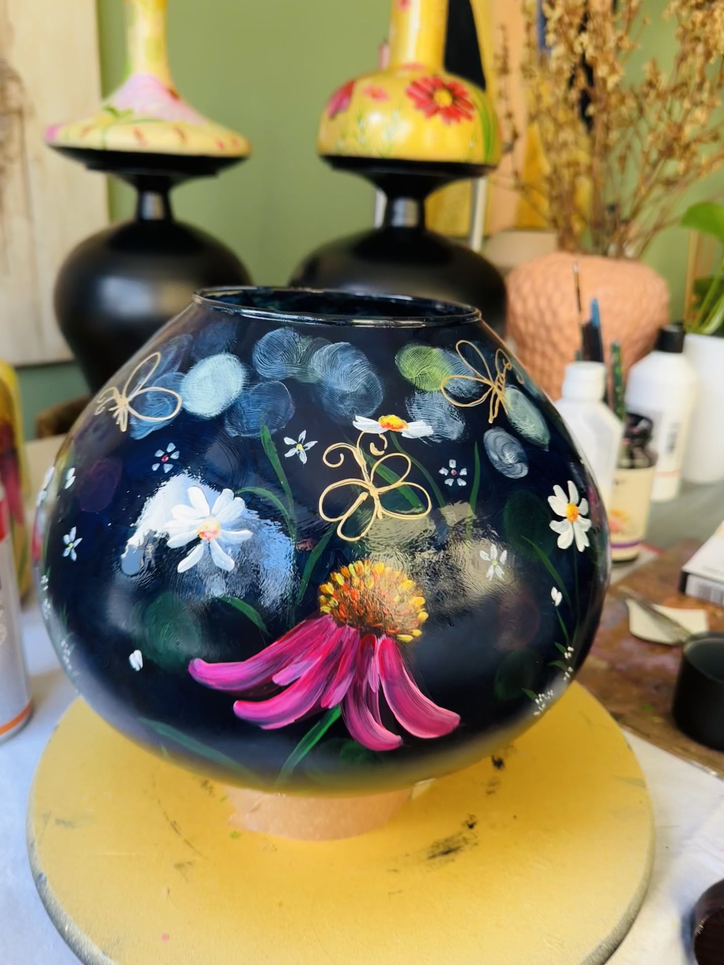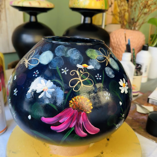 This unique hand-painted flower vase features serene color combinations that make it suitable for almost any interior, adorned with charming flowers, butterflies and gold embellish. The intricate designs cover the entire surface of the vase, making it a beautiful and vibrant piece.