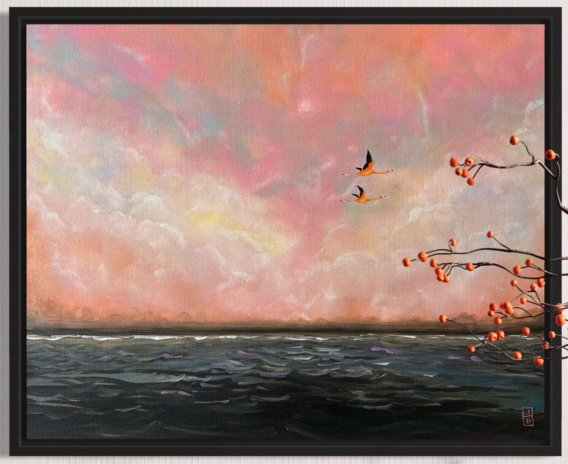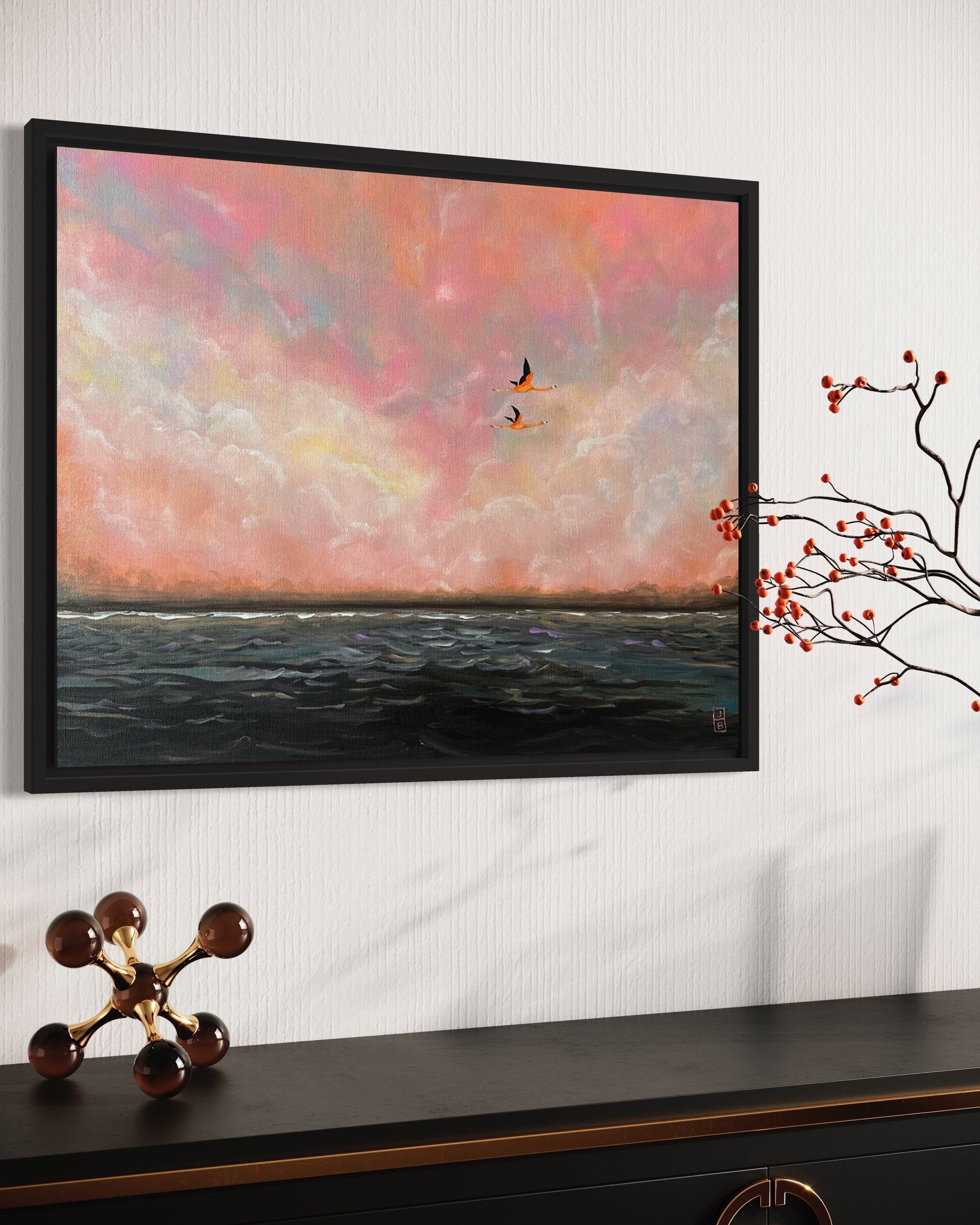 This stretched canvas is framed and ready to hang.